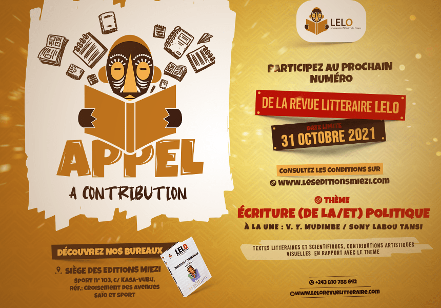 La maison d’éditions Miezi lance un appel à textes pour sa revue des Congos, Lelo. Gratuit, l’appel est ouvert à toutes les nationalités. Le thème imposé est: écriture ( de la/et) politique. Tous les genres sont acceptés: poèmes, articles, nouvelles…La date limite est le 31 octobre 2021. Pour plus de détails: revue Lelo *** ParLire la suite « Appel international à textes-Revue Lelo: jusqu’au 31 octobre »